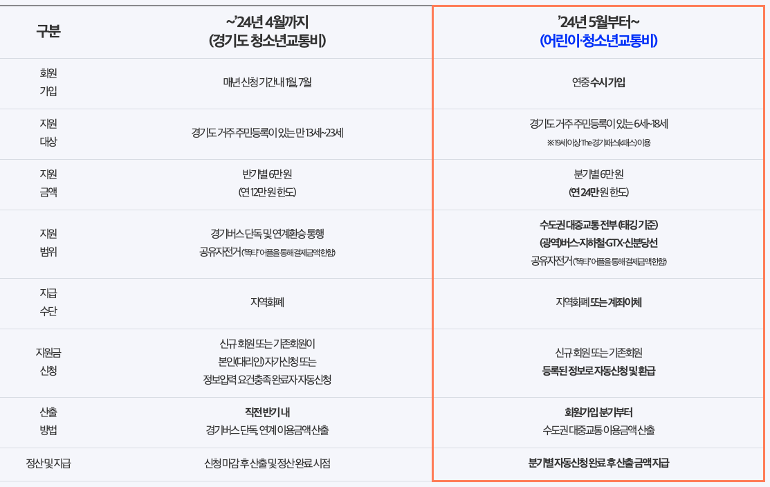 자녀를 두신 분들이 교통비에 부담을 느끼지 않게, 경기도에서 어린이와 청소년을 대상으로 교통비를 지원하는 사업이 있습니다. 2024년 5월부터는 대상자 및 지원범위 등이 변경되어 새로운 시스템으로 적용된다고 합니다.