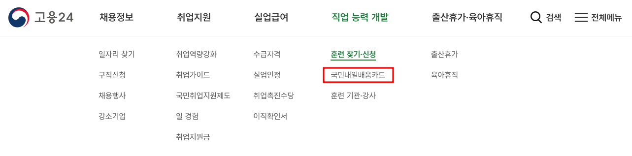 1) 고용24 홈페이지 로그인 후 '직업능력개발' - '국민내일배움카드' 클릭