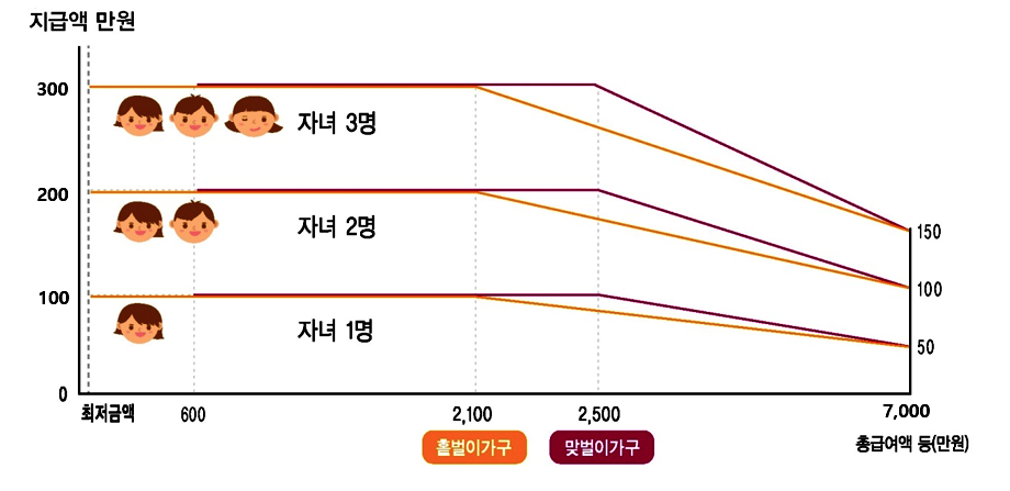 홑벌이 가구의 경우 총 급여액이 2,100만원 미만일때 자녀 1인당 100만원을 받을 수 있고, 총 급여액이 2,100만원 이상 7천만원 미만일때는 급여액의 비율에 따라 감액을 해서 지급받을 수 있습니다.