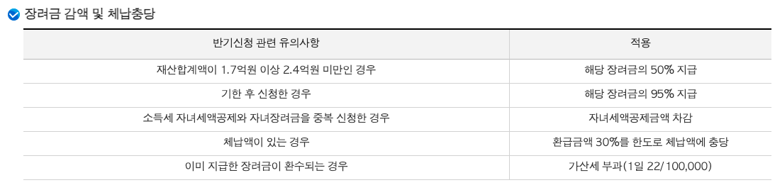 또, 재산합계액이 1.7억원 이상 2.4억원 미만인 경우 장려금의 50% 지급, 기한 후 신청의 경우 장려금의 95% 지급,